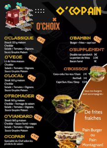 Burgers et Montagnards sur réservation (07 84 16 64 02 ou https://ocopain.business.site )